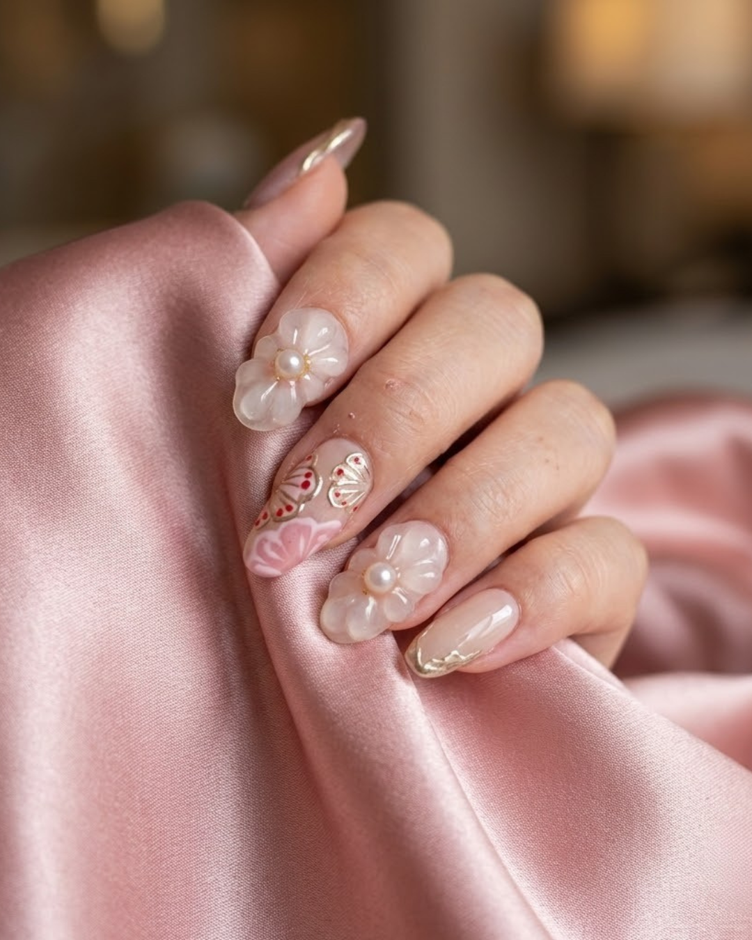 A gentle pink-lilac blend finished with pearly 3D flowers and soft metallic edges.Light, glossy, and...