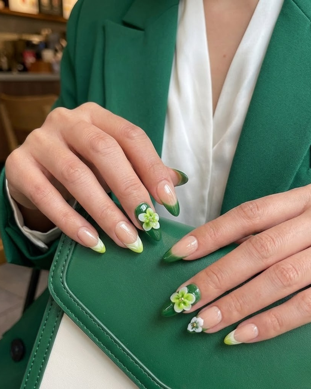 A soft nude-to-green gradient with glossy depth and fresh spring tones.Finished with hand-painted flowers for...