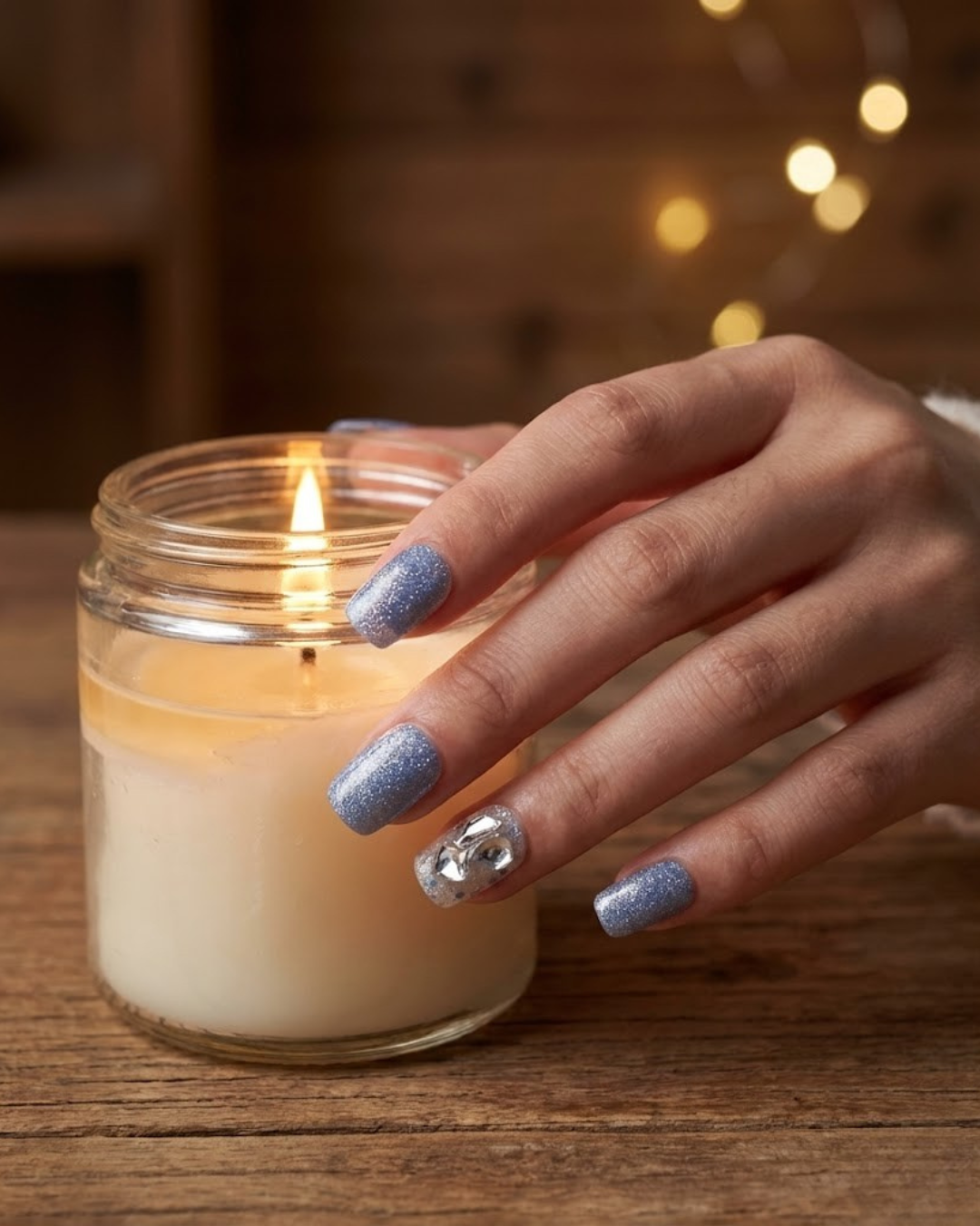 Bring a touch of celestial glow to your manicure with this stunning blue cat-eye press-on...