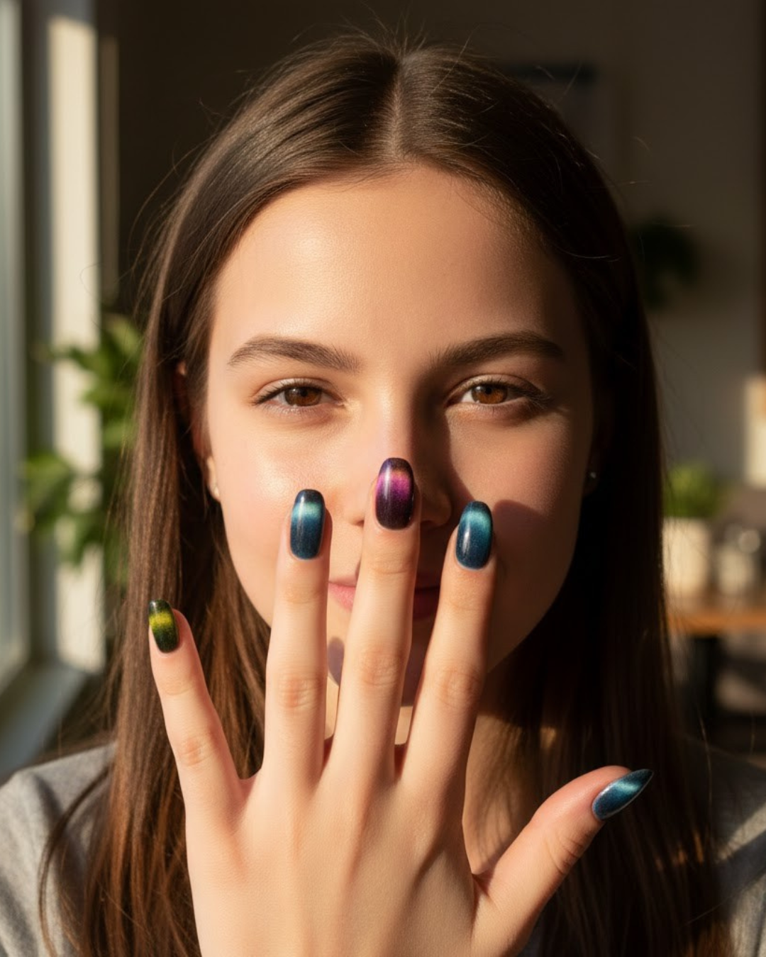 This striking multi-tone ombre cat eye nail set brings a bold yet elegant look to...