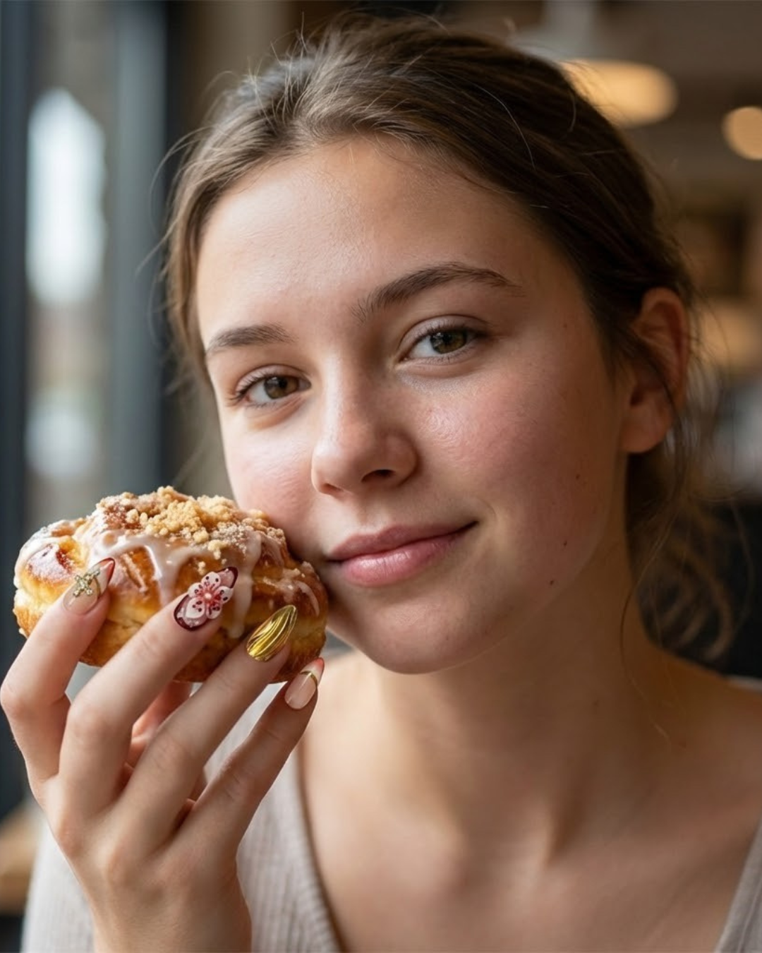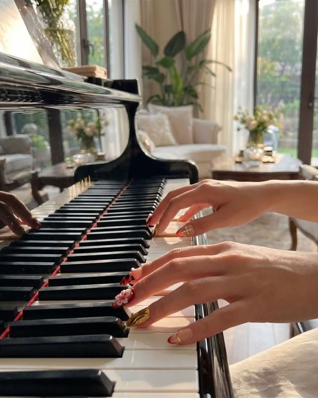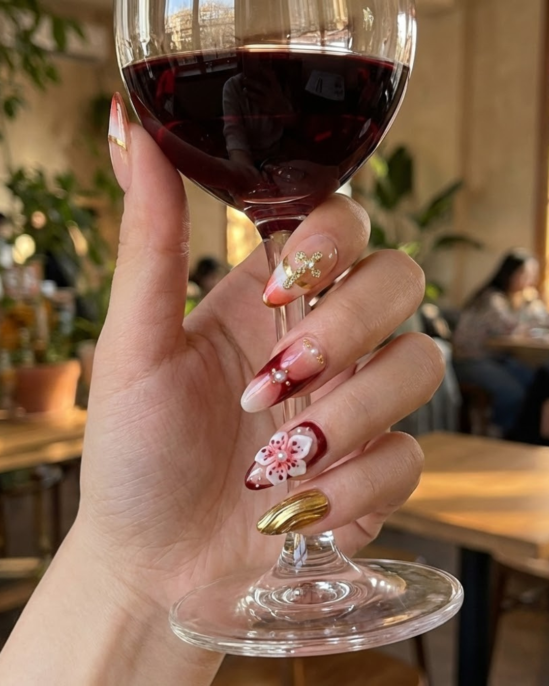 A warm nude-coral set layered with gold crosses, glossy flower art, and molten metallic accents. Soft, bold, and luxuriously detailed.