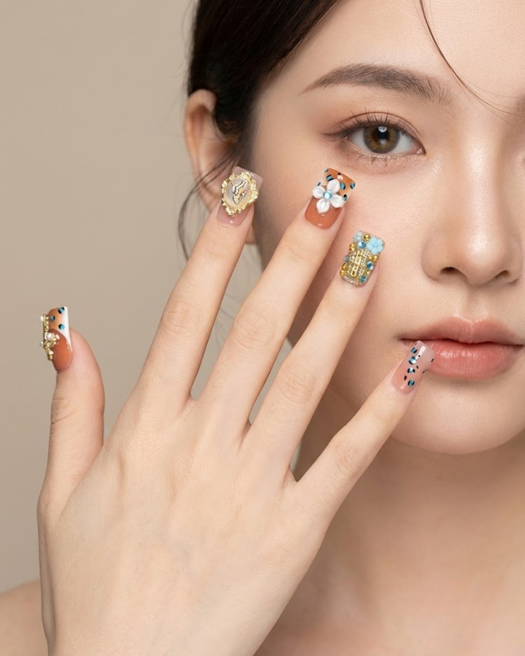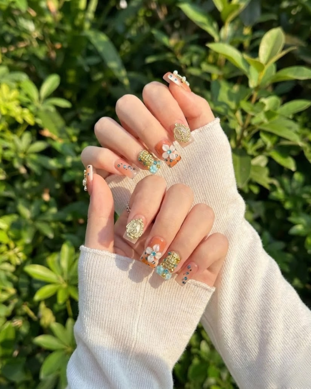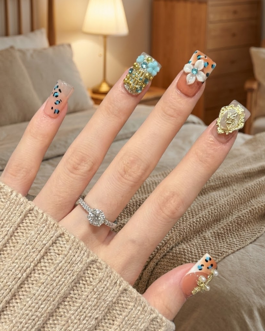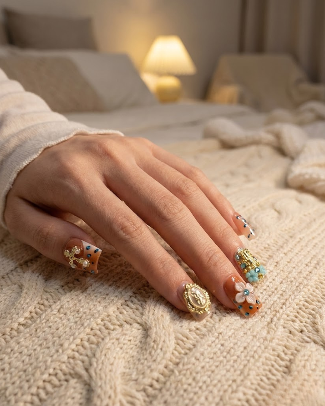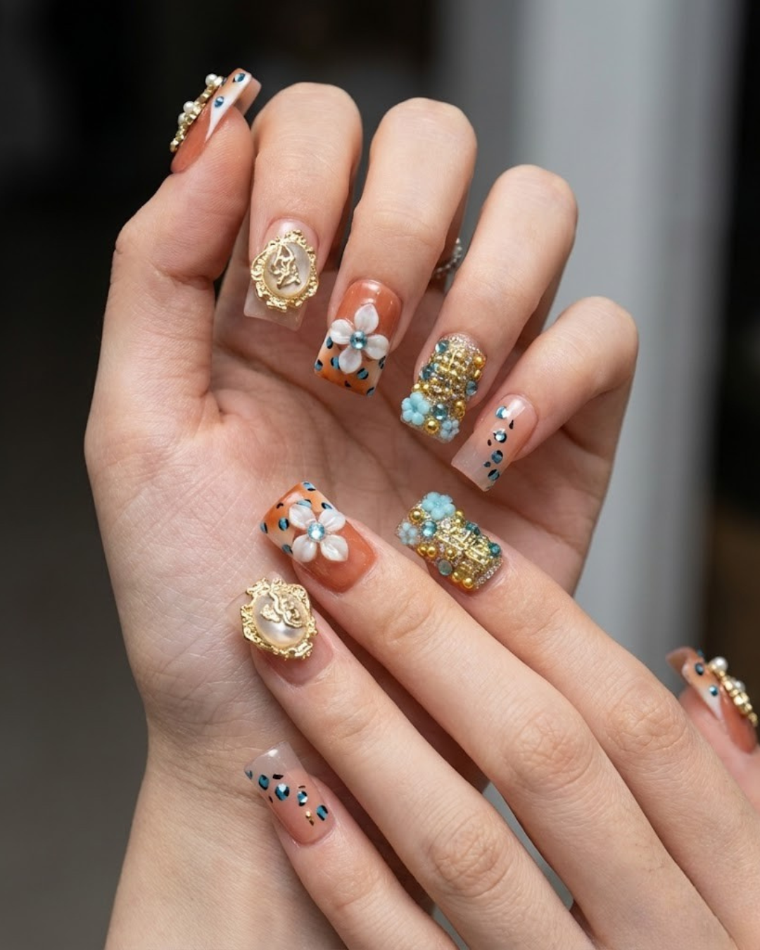 Le Clou Heavenly Grace blends soft peach tones with gold accents to create a look that feels sacred and timeless. The delicate angel motifs, jeweled crosses, and pastel blue florals bring a European vintage elegance that instantly stands out. Every piece is detailed, dimensional, and crafted to feel like wearable art perfect for anyone who loves luxury with a touch of spirituality. Whether you’re dressing up for a special moment or adding meaning to your everyday style, this set elevates your hands with a quiet, radiant glow.