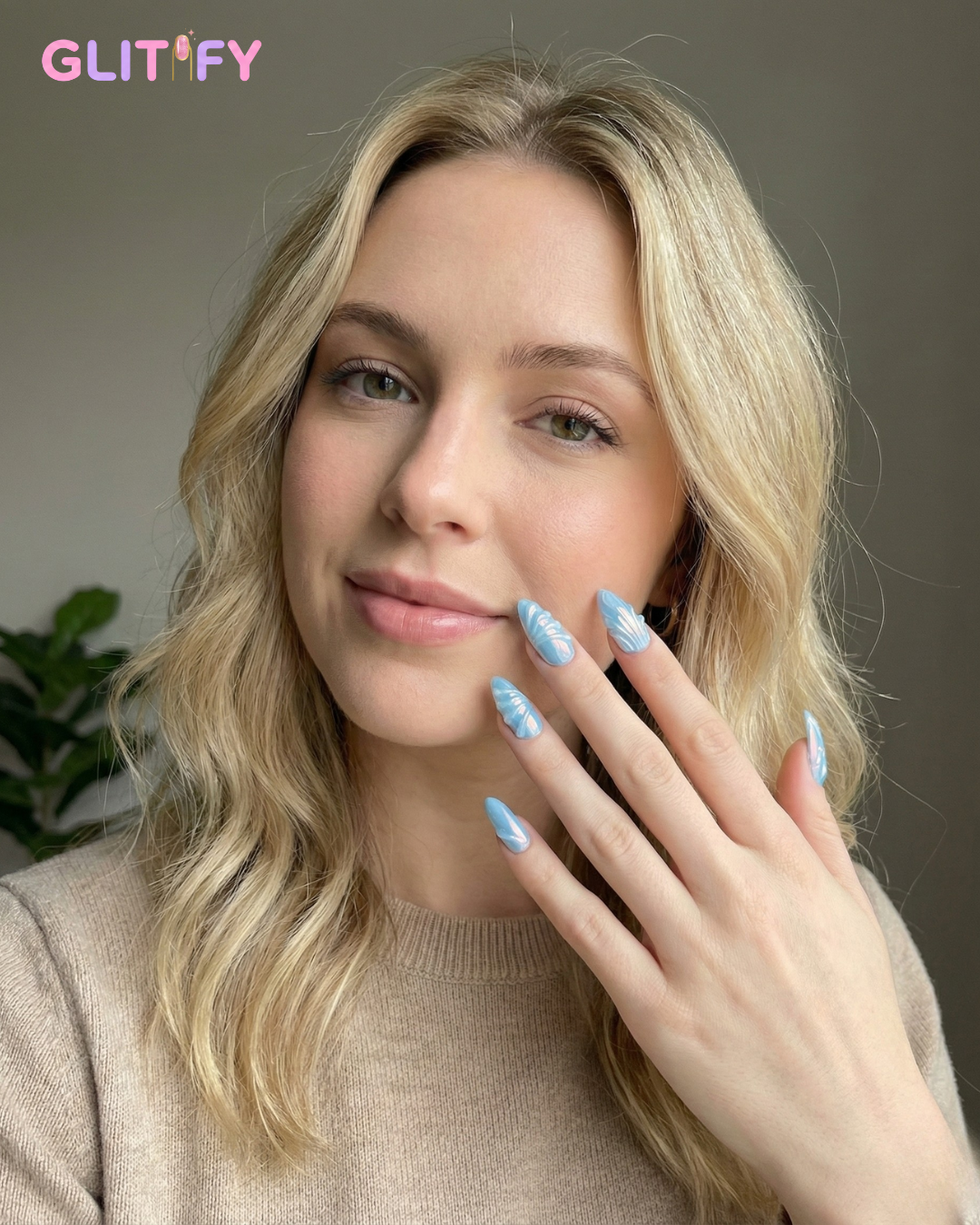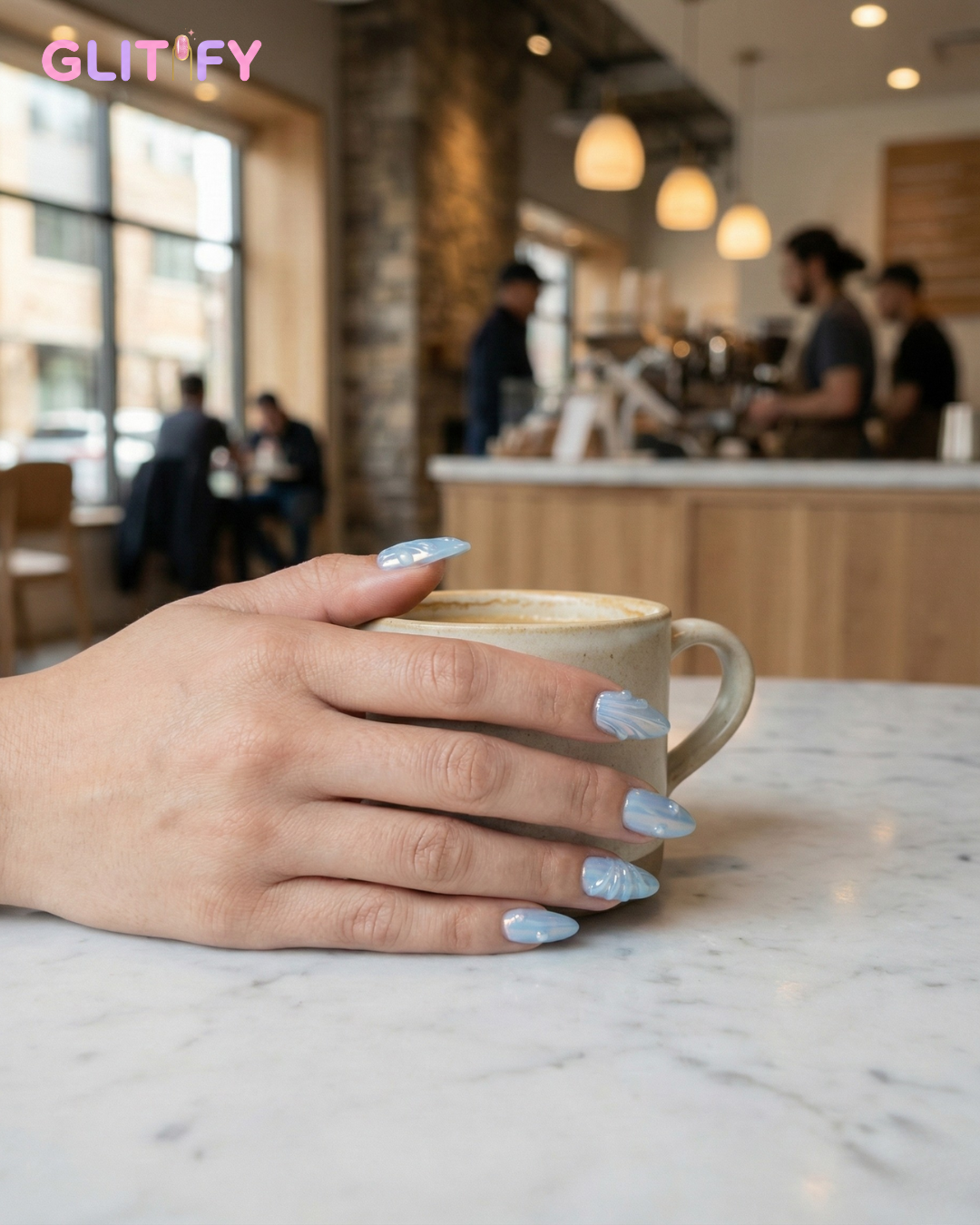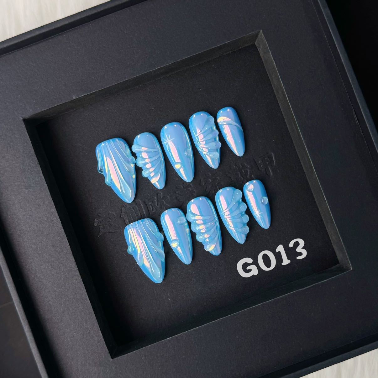 Ocean Veil feels like a quiet breath by the shoreline — calm, cool, and effortlessly striking. The soft blue base flows into hand-carved ripple details, giving each nail a liquid-glass depth that catches light in the most beautiful way.