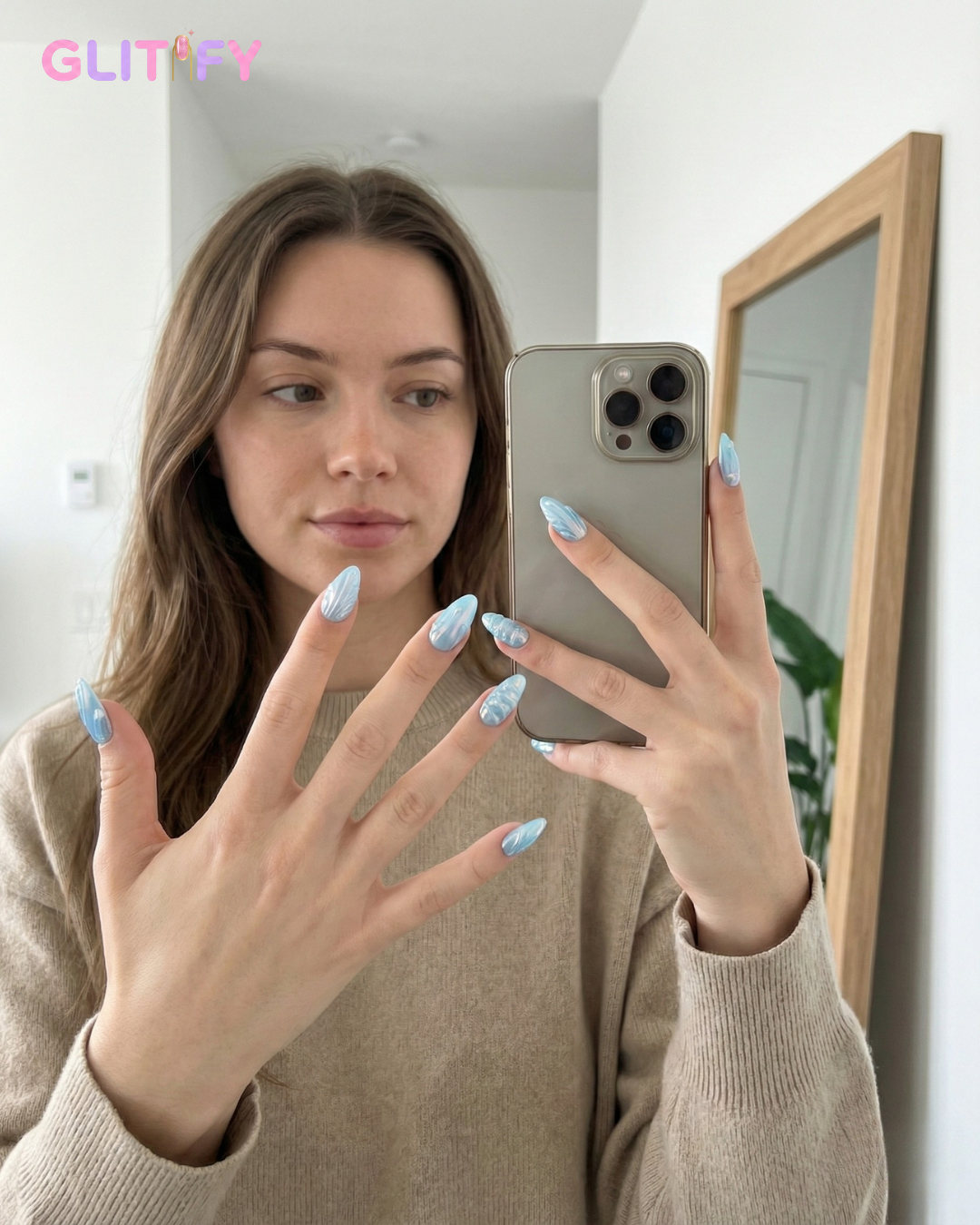 The white strokes and pearl accents add a lifted, airy feel, almost like sunlight dancing across water. It’s bold without shouting, artistic without trying too hard.