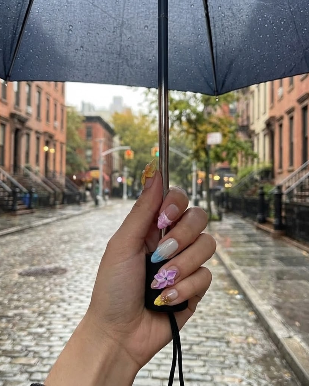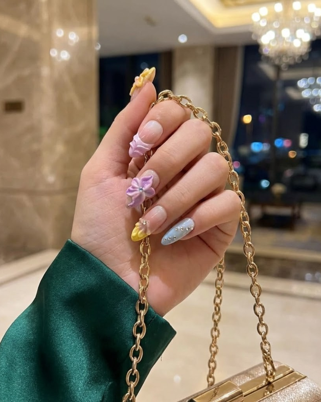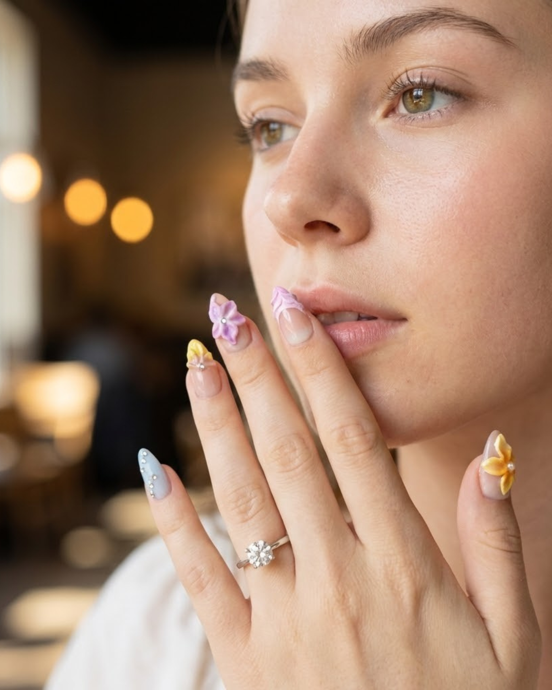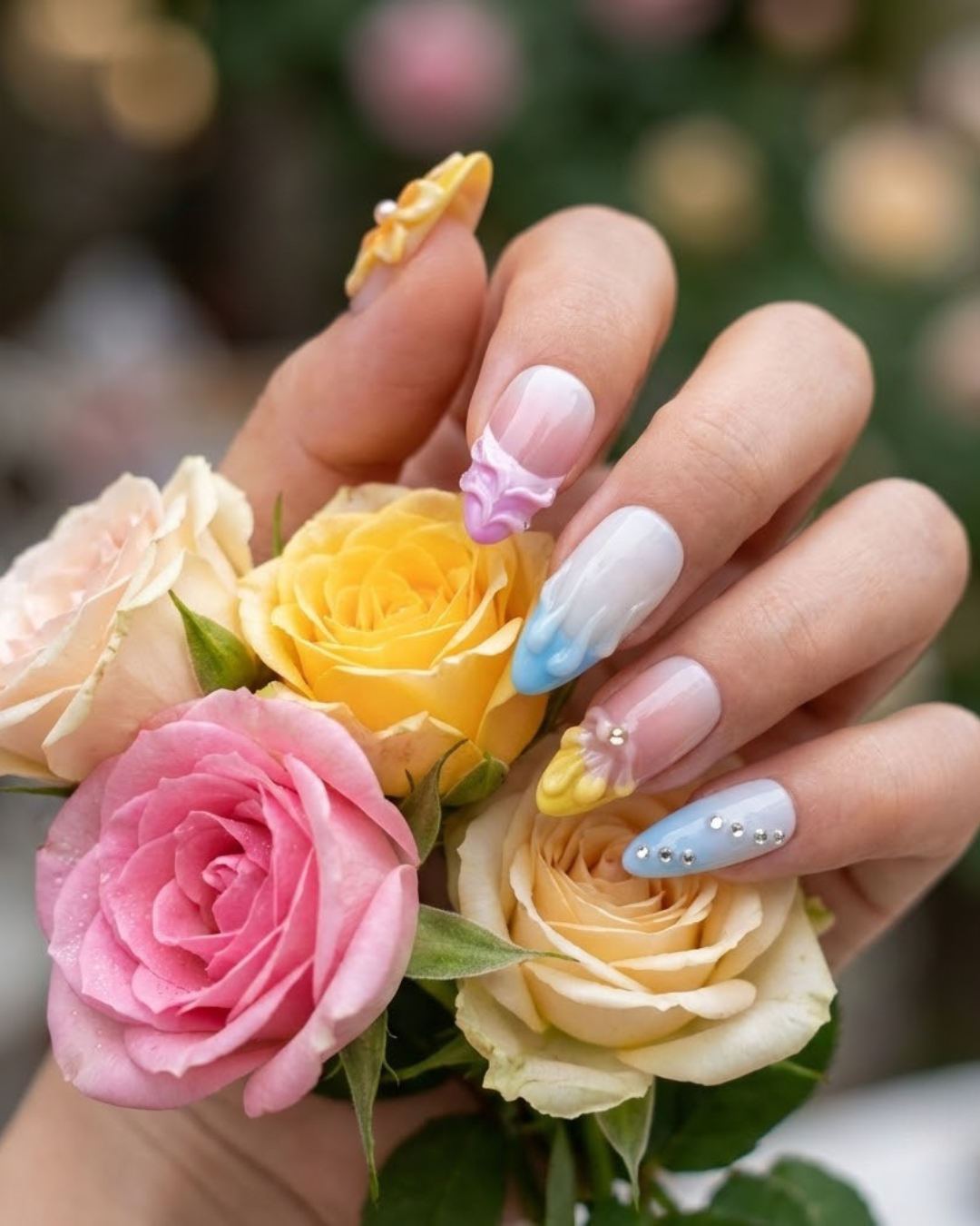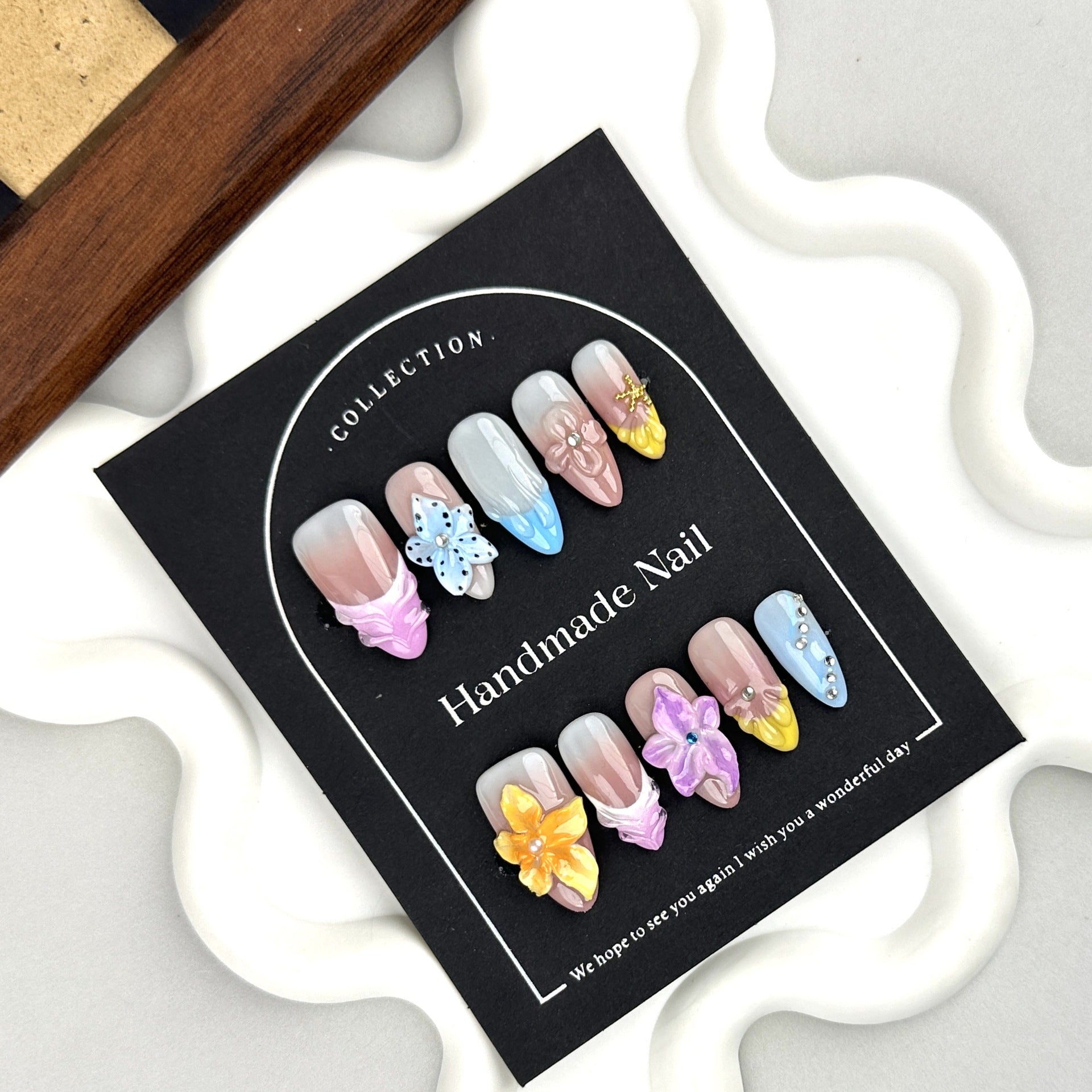 Petal Drift feels like sunlight moving across a garden — soft gradients, airy pastels, and sculpted floral details that make every nail look like a tiny piece of art. The colors shift from warm yellows to calming blues and blush tones, giving the set a dreamy, floating effect.